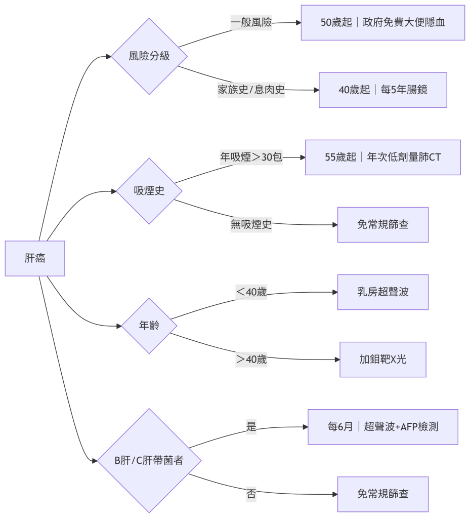 • 吸煙者:年吸煙>30包者,55歲起每年低劑量肺CT(輻射≈自然暴露6個月)