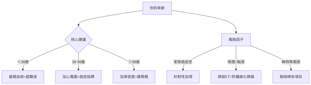 25歲起做基礎血檢,30歲加心電圖/超聲波,40歲起每年全面檢。