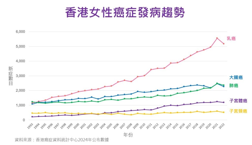 - 乳癌:佔女性新發癌症28.4%,最年輕患者僅25歲,40歲後發病率劇增2。